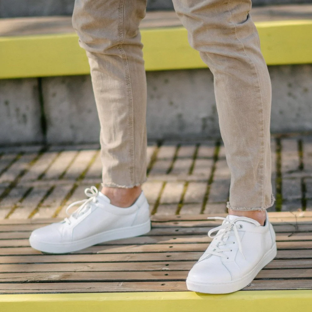 AHO Premium-Sneaker – aus hochwertigem, genarbtem weißem Nappaleder gefertigt. Der AHO Low-Top-Sneaker vereint nordischen Minimalismus mit lässigem Luxus und sorgt für angenehmen Tragekomfort im Alltag. Perfekt kombinierbar mit Slim-Fit-Jeans und Blazer für einen smarten Look oder mit Jeans und Lederjacke für einen entspannten Auftritt.